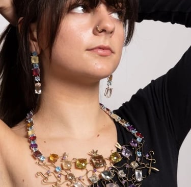 This is done by embracing flawed gemstones and unique materials to create pieces that appear extravagant by showcasing jewelry aesthetics and trends from the 18th century and setting non-precious materials and flawed gemstones there for adding value back to these materials.